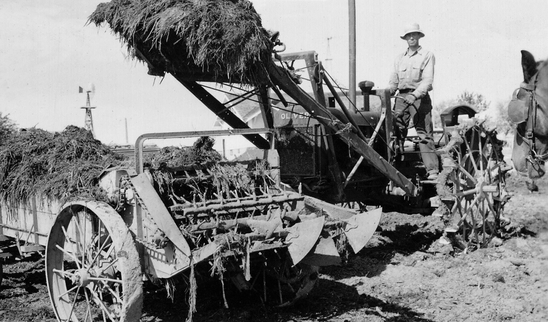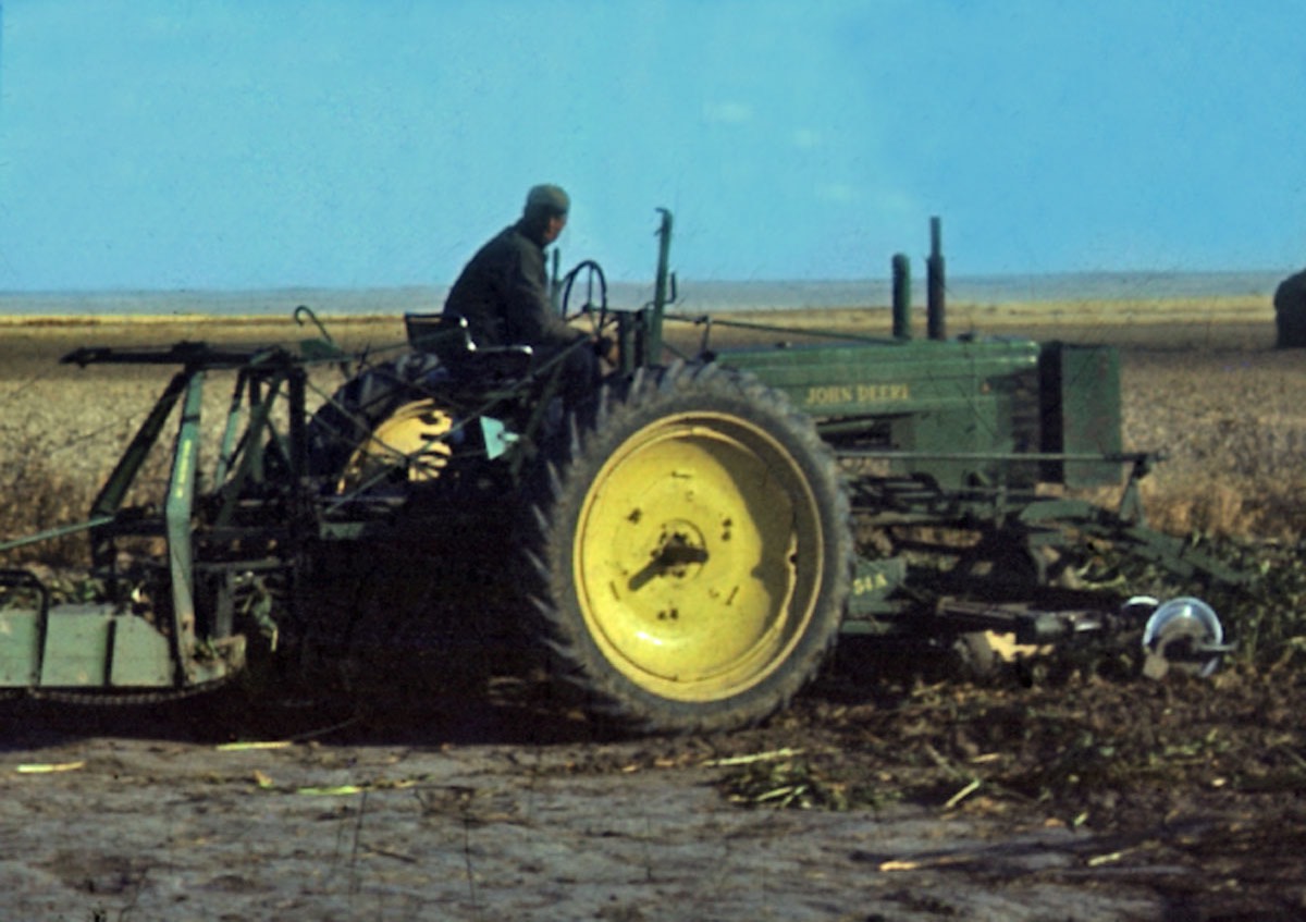 Clarence on 1948 John Deere BN tractor, harvesting sugar beets with the John Deere 54-A beet harvester, 1949.
