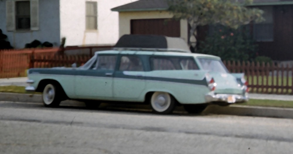The family's 1957 Dodge Sierra station wagon in fron of Fred and Ernie May's home in California, Christmas 1957.