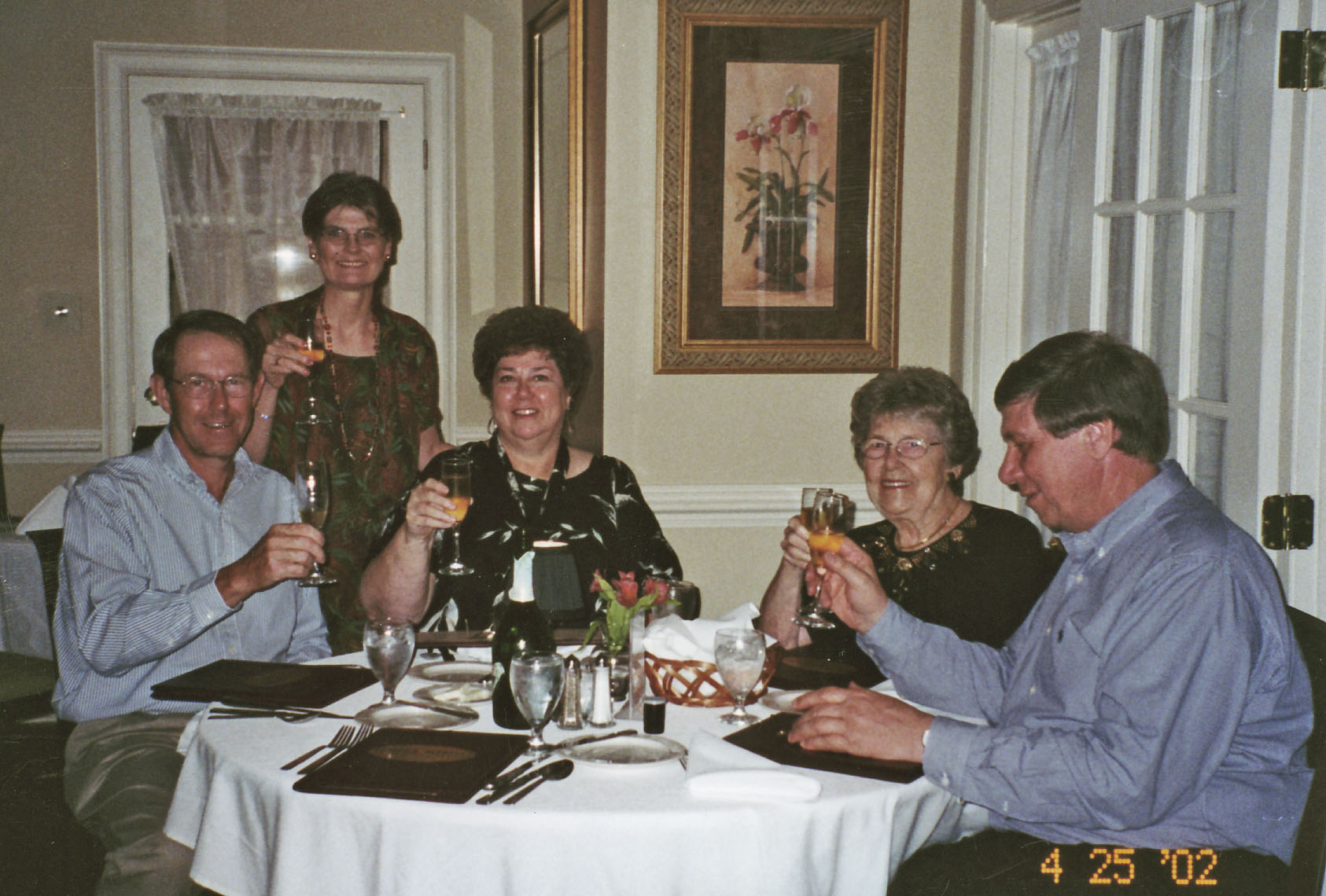 Tom, Linda, Sharon, and Lyle celebrate Esther's 85th birthday, in Hattiesburg, 2002.
