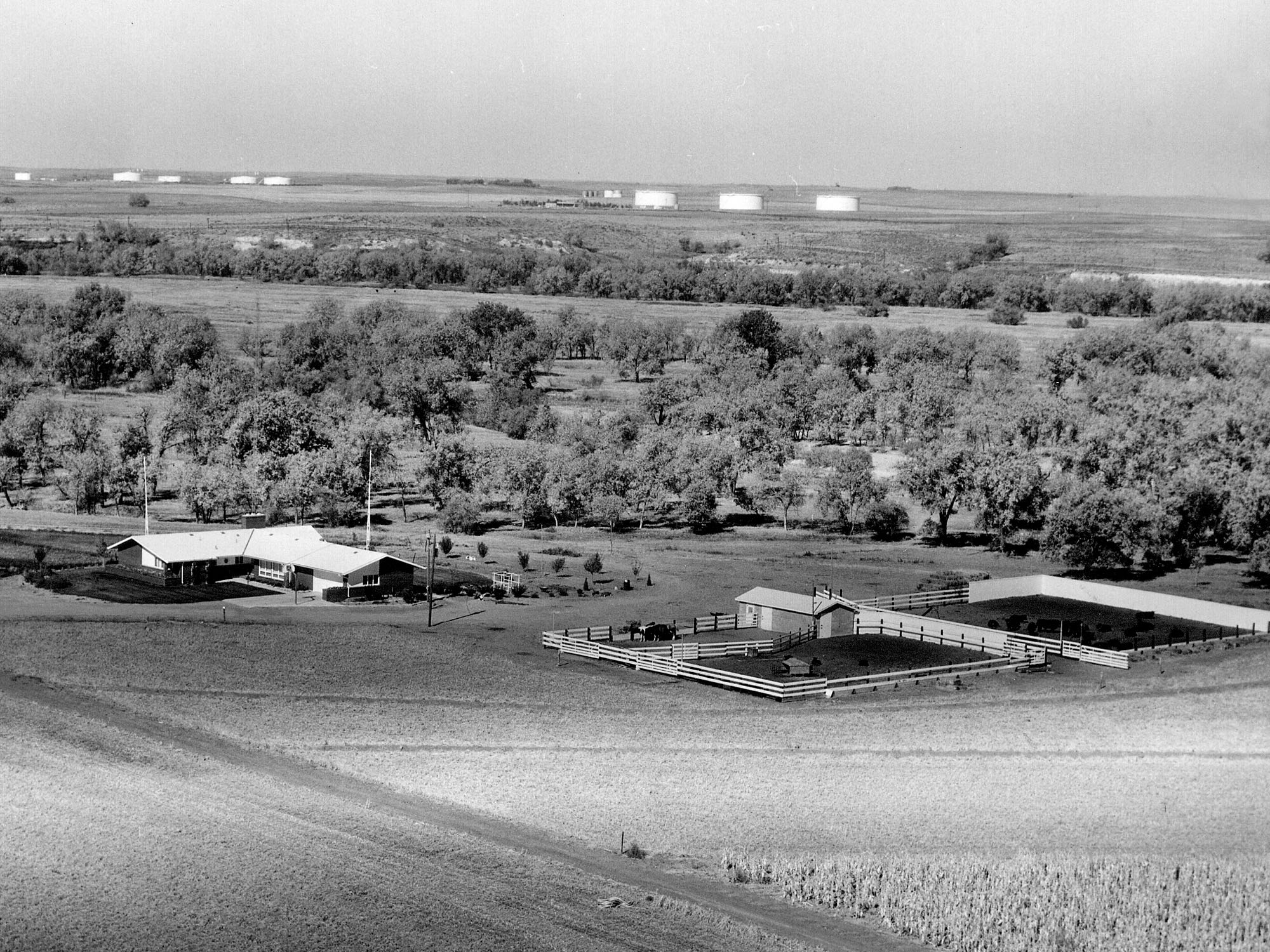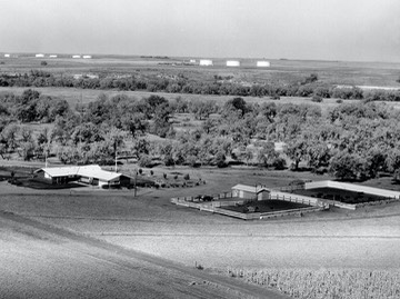 Aerial view of Clarence and Esther's home near Merino, Colorado, from 1962 to 1969. South Platte River behind the property. Clarence raised registered Angus cattle (visible in corral) and Steve had horses. White poles behind house were supports for Tom's ham radio antenna.