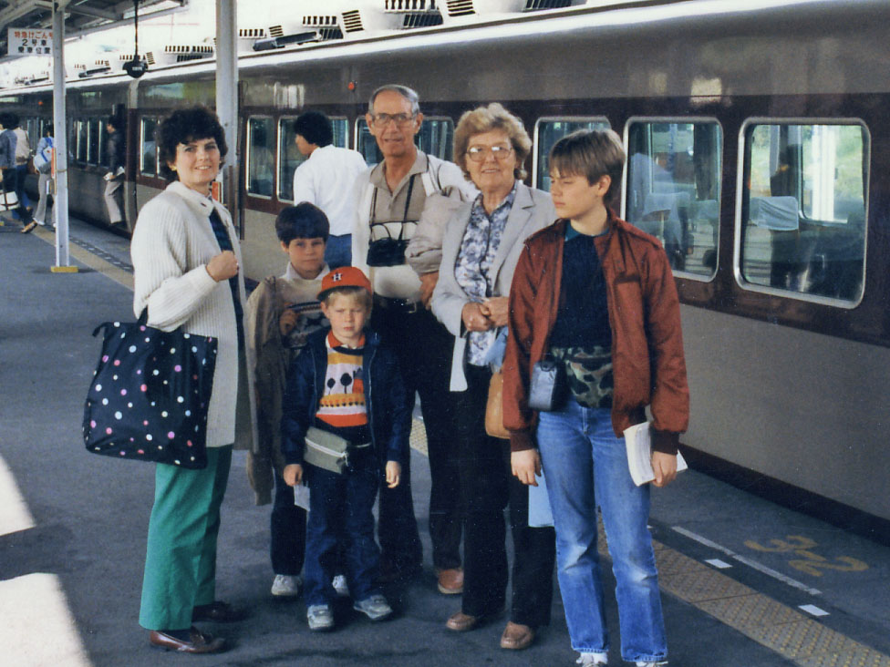 Linda, Jordan, Adam, Clarence, Esther and Eliot on the platform for trip to Nikko, Fall 1984.