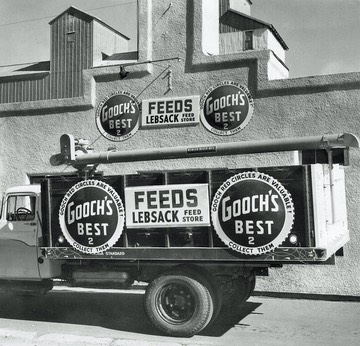 Bulk feed delivery truck, a 1959 Dodge D500 with Omaha Standard grain box and Wenger auger.