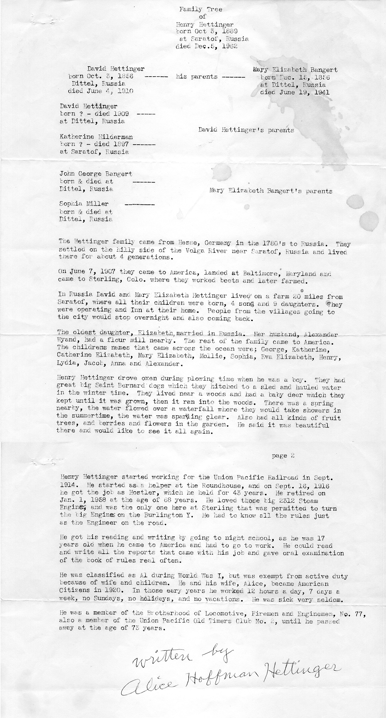Hettinger Family History, written by Alice Hettinger.