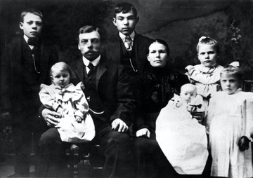 George and Anna Elizabeth (nee Bangert) Hoffman Family, about 1903, the time of their arrival in the United States.(L-R) Phillip, Jacob (baby), George (G.J), George (J.G.), Anna Elizabeth, Molly (baby), Alice, and Elizabeth.