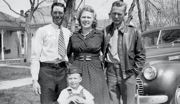 Clarence, Lyle and Esther Lebsack with Hank, 1943. Henry Hettinger's 1940 (1941?) Buick in background.