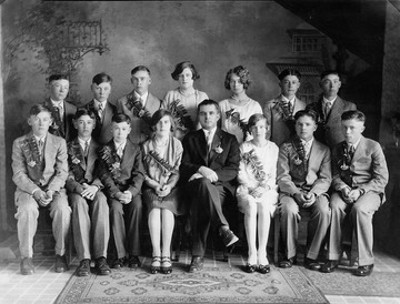 Clarence’s Confirmation Class, 1929; Back (L-R): Aaron Walter, John Sterkel, Henry Schuman, Helen Bauer, Maria Sorch, John Weber, Albert Sinner; Front: J. Sinner, Clarence Lebsack, Reuben Reuter, Emma Bauer, Rev. J.P. Flemmer, Mollie Sterger, Henry Schott, Adolf Miller