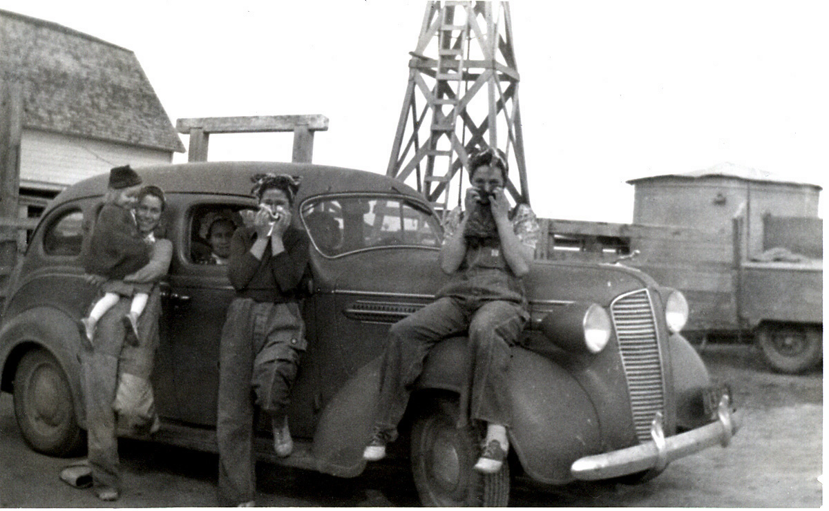 (L-R) Bonnie, Emma, Katherine (in car), Ernie and Freda, about 1940.