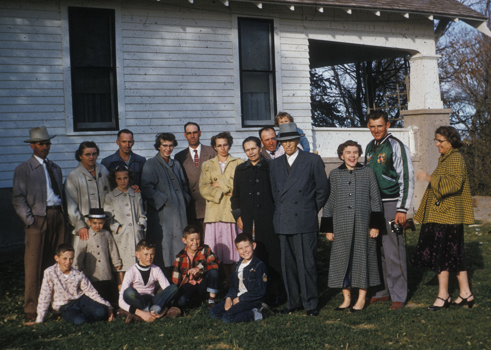 Lebsack family at Schuppe's home, Proctor, 1956. Standing, L-r: John, Mary, Johnny, Marla, Fred, Bonnie, Clarence, Rachel, Katherine, Pack, Jacob (Janie in back, Francis, Robert, and Lydia. Sitting: Gordon, Allen, Tom and Tom.